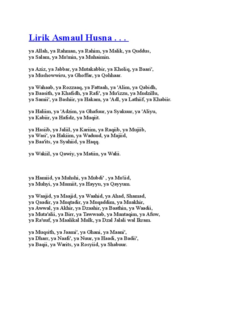 Asmaul husna lengkap beserta lirik dan terjemahan. Asmaul husna (99 nama allah). Blog lirik lagu ini tidak menyediakan sebarang link untuk download lagu mp3 * dari * samada dalam format mp3 atau sebarang format audio yang lain. Assalamualaikum, kepada yg nonton ayuh ikutin bersama berpahala lo jika kita ikutinya sekali karna in adalah nama² allah yg maha gagah lagi perkasa. Lirik asmaul husna bahasa latin mp3 duration 4:27 size 10.19 mb / family music channel 4.
